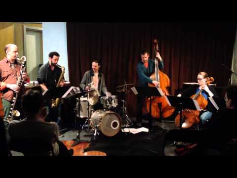 The opening composition, “October 12,” began with pizzicato viola scrabble, low cello moans and the rattle and ping of gongs and small percussion instruments, before reeds began long, lowing waves atop Niggenkemper’s furious arco. Each reedist took extensive, deep solos that were both commanding and focused, though these extemporizations were partly textural and rooted in contrast, against the strings that swooped over Van Hemmen’s tinny, precise motion. Originally from Holland, Van Hemmen approaches classical precision with a decidedly roguish and unfussy physicality, so his playing feels both utterly spontaneous and quite poised. Programatically, Loriot and Kretzmer dovetailed in duo before engaging in high-pitched, explosive knots; as with the bulk of the New Dilemma book, there is a tendency to focus on duos and trios (Sinton and strings followed), while at the same time allowing relationships between these small group areas to define a truly massive whole. Rather than emphasizing how “big” the sextet could sound, this music felt quite spare and localized. Traditional jazz (or even free-jazz) rhythm seemed to be less of a concern, though at times the music did open into an off-kilter, dissonant stride as horns and rhythm would egg one another on in pulsative commentary – Niggenkemper being a good choice to carry the sextet in deft, hairy precision.